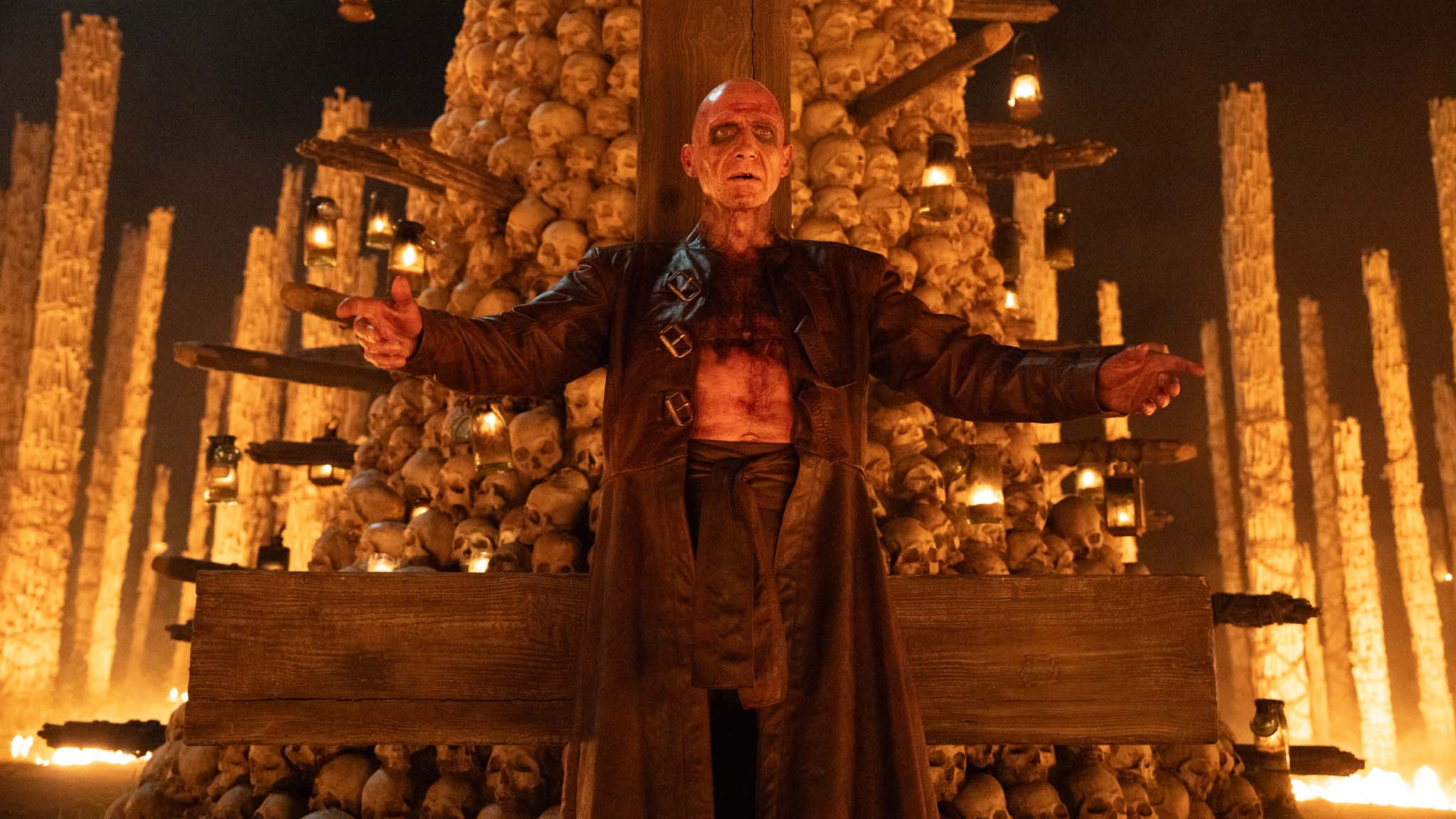Meanwhile, Dr Kelson (Ralph Fiennes) continues to honour the fallen at his towering memorial of skulls and bones. The iodine-slathered medic forges a curious connection to Samson (Chi Lewis-Parry) and uses morphine-tipped blow darts to temporarily sedate the hulking Alpha and safely remove arrows from the infected brute’s torso. “You owe me one,” quips Kelso to his incapacitated patient. “Just kidding. I’m NHS – no charge!” As Samson recuperates, continued observation reveals a new glimmer of hope for survivors of the contagion.
